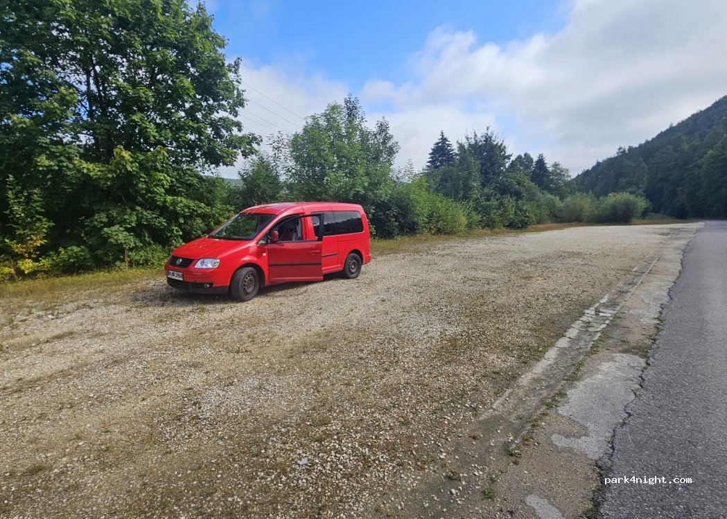 Geschotterter Platz neben einem verlassenen Steinbruch. Kaum Verkehr. Keine Verbotsschilder. Viel Platz, aber kein offizieller Parkplatz.