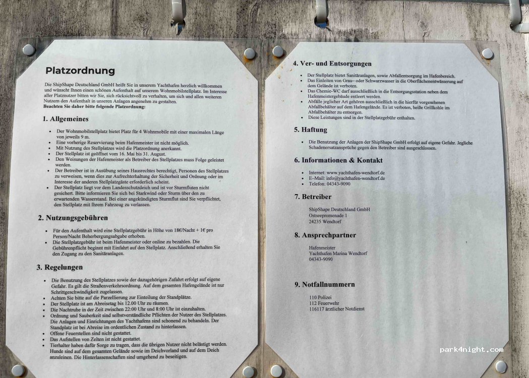 Parking space for 4 mobile homes in the Marina Wendtorf yacht harbor. Restaurants/fish snack bars and ice cream parlors in the immediate vicinity, to the Laboe naval memorial about 5km along the dike.