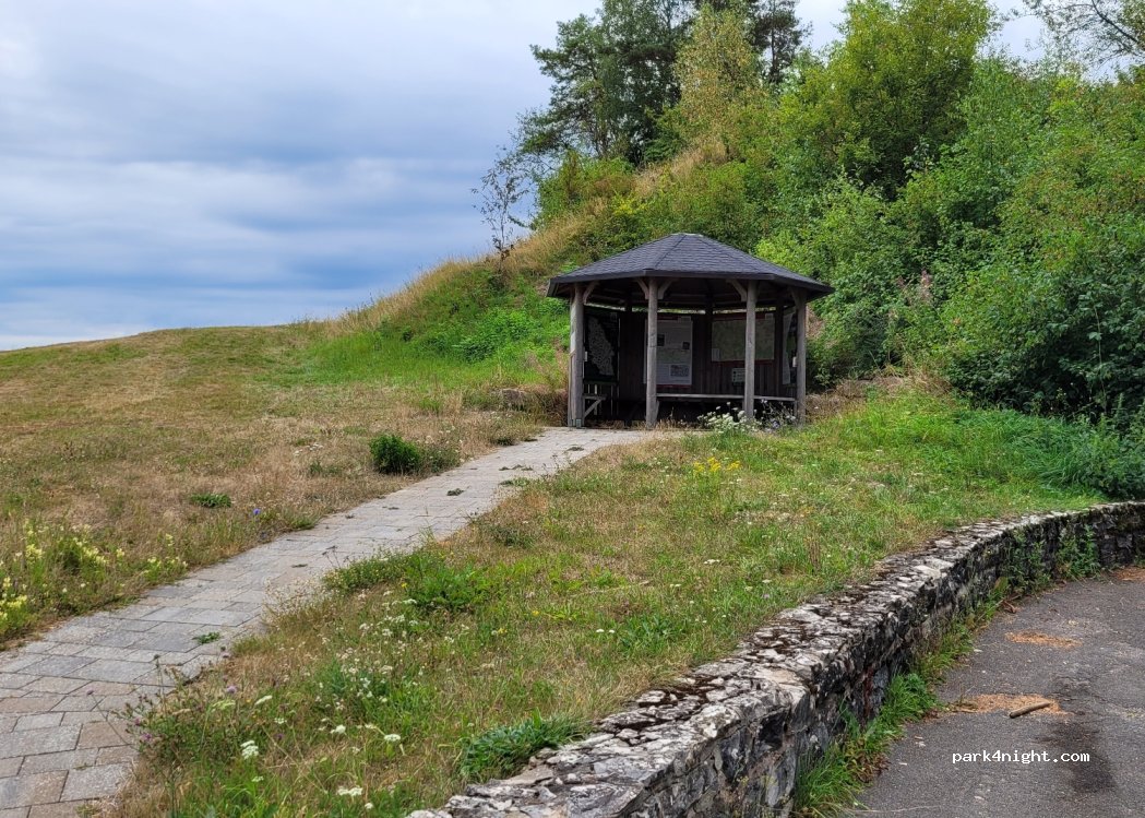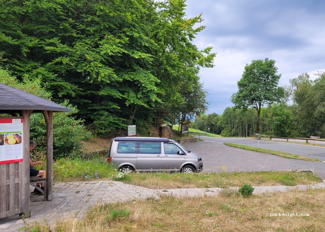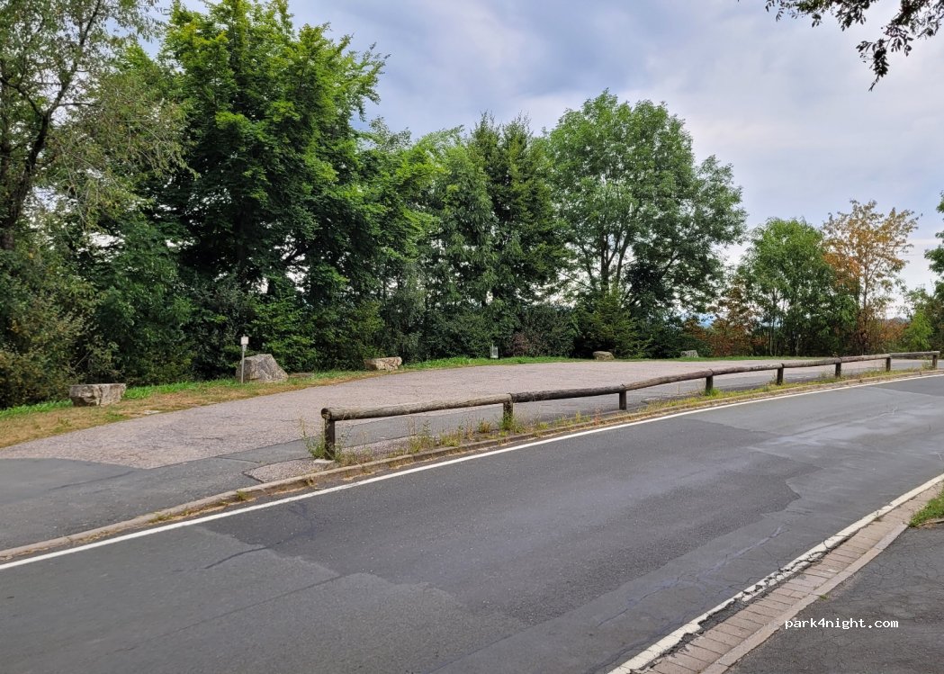 Large parking lot for the NaturKunstRaum Neubürg. Worthwhile stopover. Right on the road, little traffic, quiet at night. Information pavilion with bench. Special, easy hike on the path/table mountain with numerous art installations, some benches and a wide panoramic view. Starting point for further hikes and bike tours.