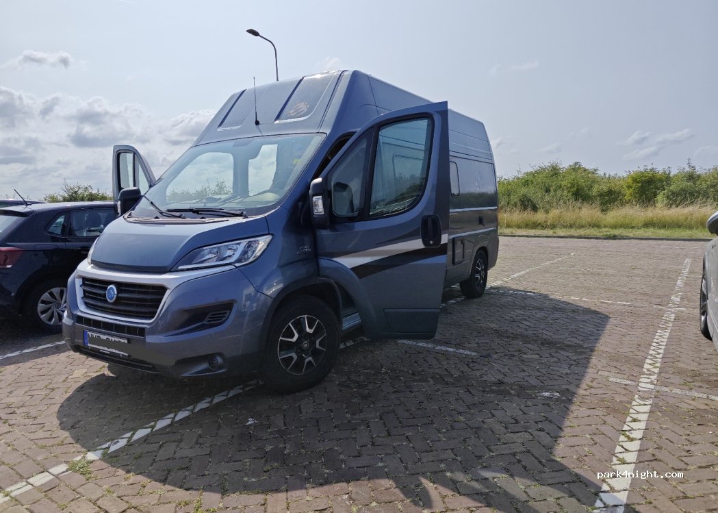 Large parking lot at the ferry, no restrictions. Larger spaces immediately to the left (car with trailer/camper, motorhome...) Toilets for 50 cents fee at the bike rental (there are also e-bikes). Direct access to beach paths and along the promenade to the town.