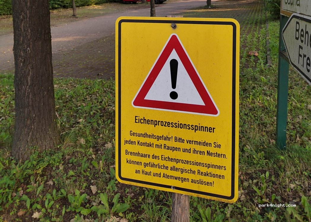 Parking lot at the Münstermaifeld adventure pool. No prohibition signs. Sign warning of oak processionary moths, but none seen