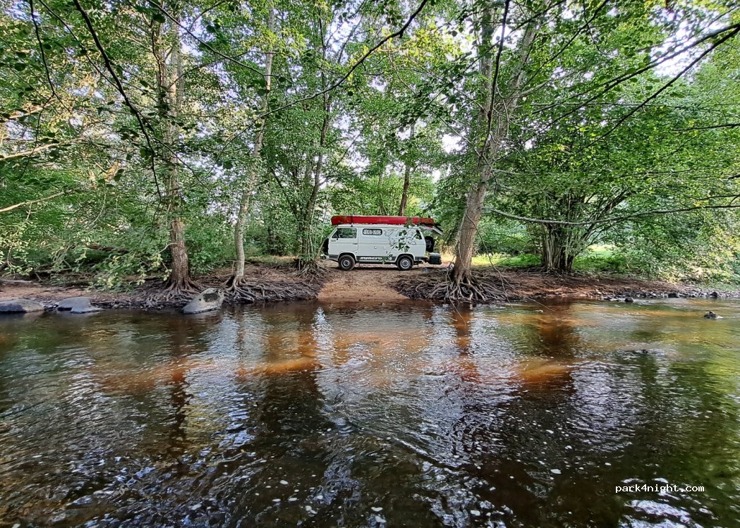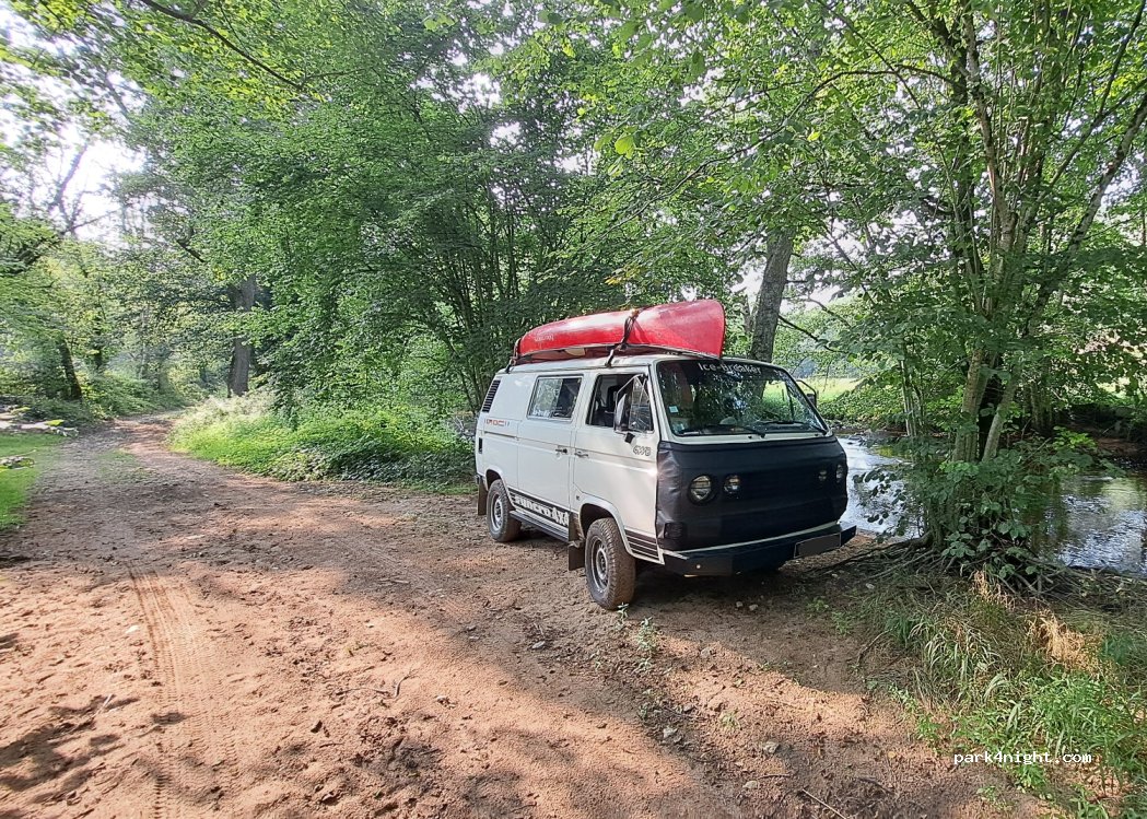 Au calme, entre pâture et rivière, sous les arbres. Idéal pour petit van ou tente de toit.