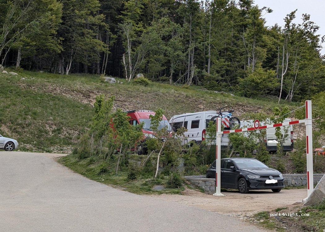 Dit is een parkeerplaats, geen camperplaats. Er zijn dus geen voorzieningen voor campers. Wel is er een openbaar toilet achter het restaurant waar ook een winkeltje naast ligt. Er zijn nog 2 restaurants en een skilift. Dit is <5min lopen van de parking. Je mag hier als camper krap op elkaar staan tussen de auto’s maar na 17:00 gaan auto’s weg en is er meer plek voor de overnachting. Slapen doe je rustig hier. Uitzicht is OK met zonondergang tussen de bomen door.