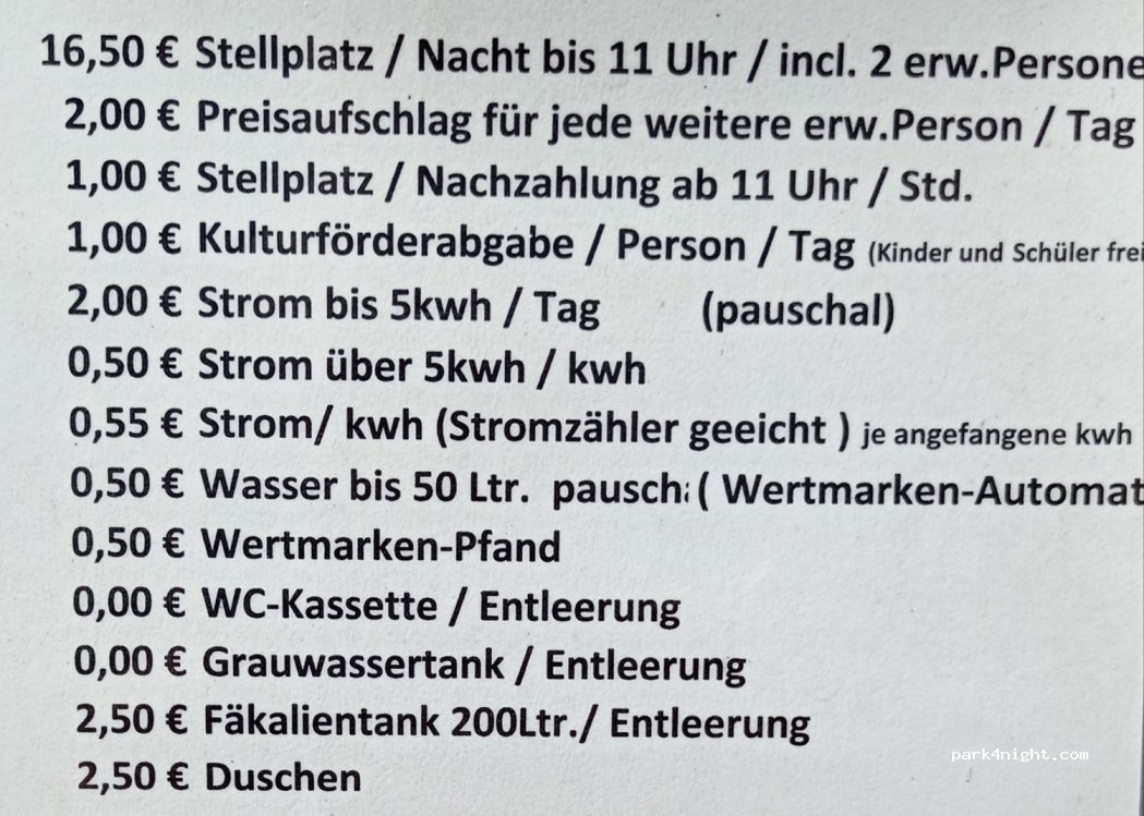 Waren nur zum Ver- und Entsorgen dort. Kassette entleeren 1,50€ und Trinkwasser 100 l Kosten 1 €. Betreiber sehr freundlich und hilfsbereit.