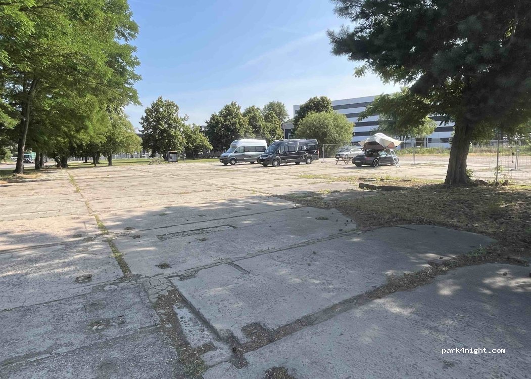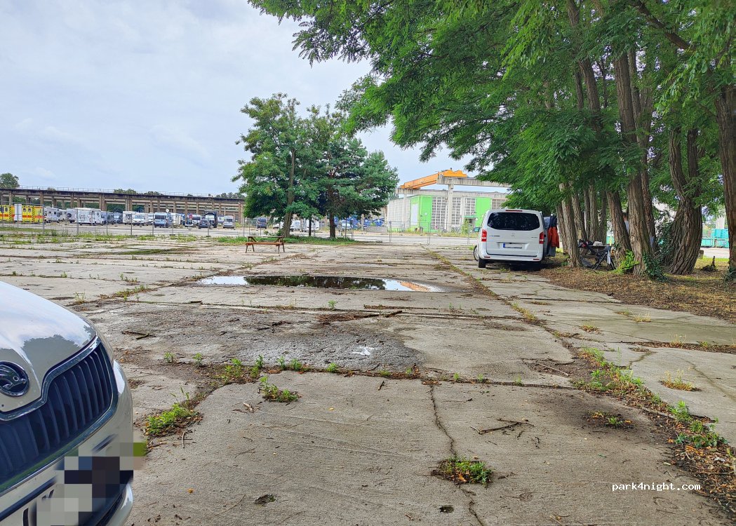 Parkfläche auf Betonplatte mit abgeschlossenem Bauzaun. Achtung: Schlüssel nur bis 22 Uhr an der Rezeption. Trotz Angabe „Anreise nach 22 Uhr“ bei der Buchung wurde darauf nicht hingewiesen und wir mussten die Nacht bezahlen. Ab 5 Uhr extremer Lärm durch Container-LKW. Bis 23.30 Lärm durch Hostel-Lounge. Toiletten und Duschen im Hostel sauber. 15€/Nacht. 50€ Schlüsselpfand.