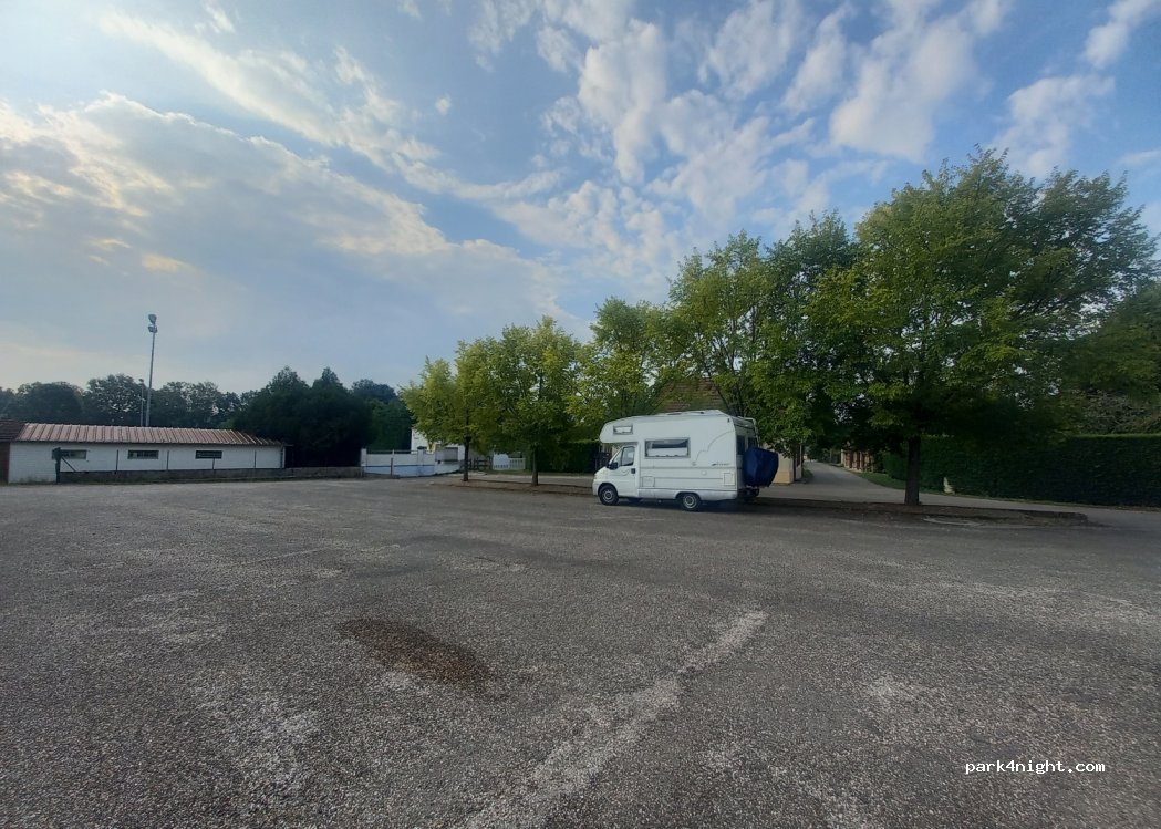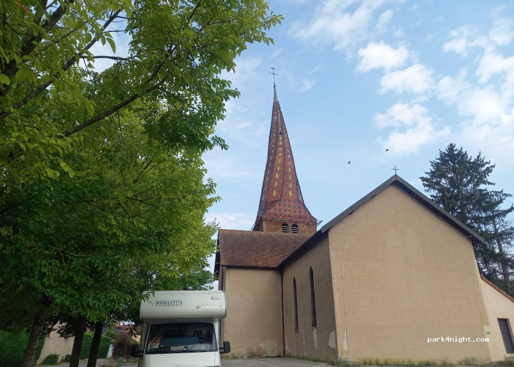 Aparcamiento gratuito entre la hermosa iglesia (techo decorado característico) y las instalaciones deportivas. Bastante plano. Las campanas suenan y el tren se oye a lo lejos, pero los ruidos de la calle son ahogados. Esta noche éramos solo nosotros.