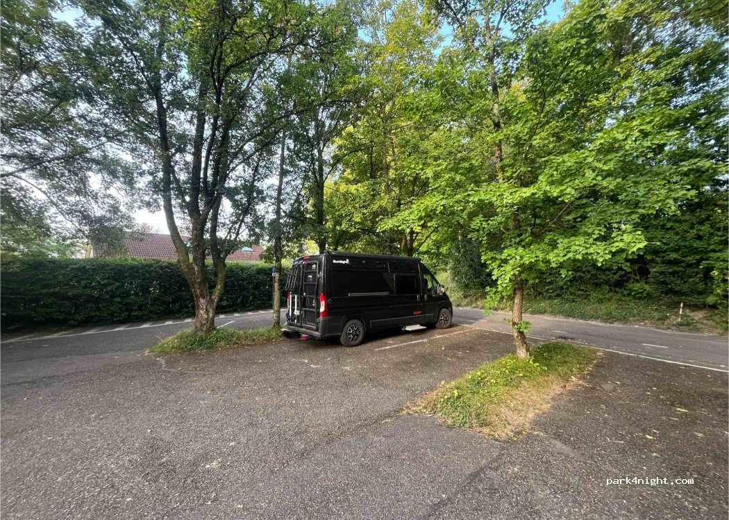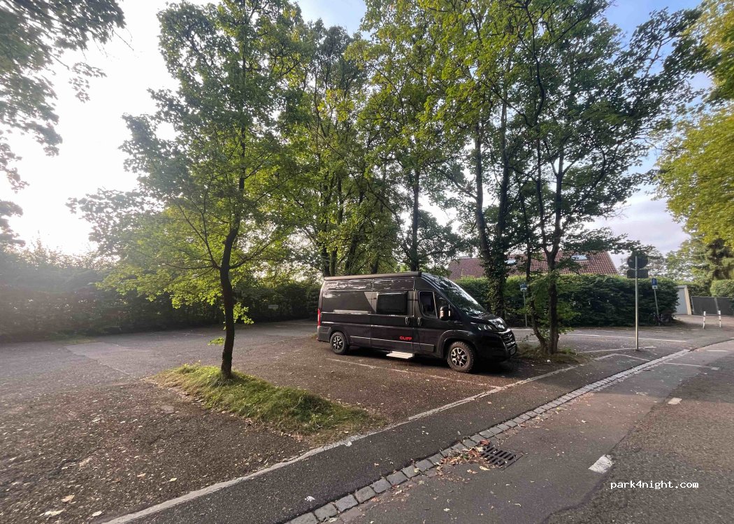 We parked here for one night during our journey. We arrived late at midnight and left at 9 am. Spot next to a public swimming pool and quiet at night. In the morning people walk their dogs here and that’s it. For one night absolutely okay.