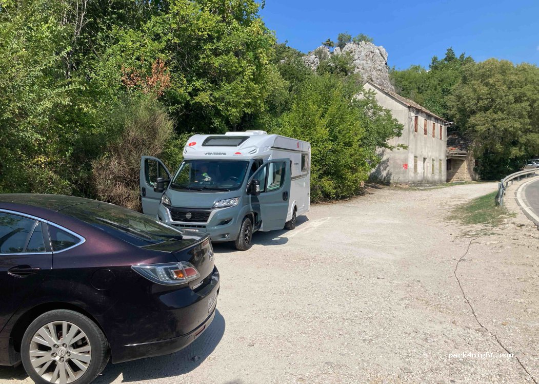 Large parking lot for camper vans for a visit to the Klis Fortress near Split! Due to the size of our camper van (741 cm) there were hardly any parking spaces at the fortress! From this parking lot there was a hiking trail (approx. 20 minutes) with beautiful views of the castle!
