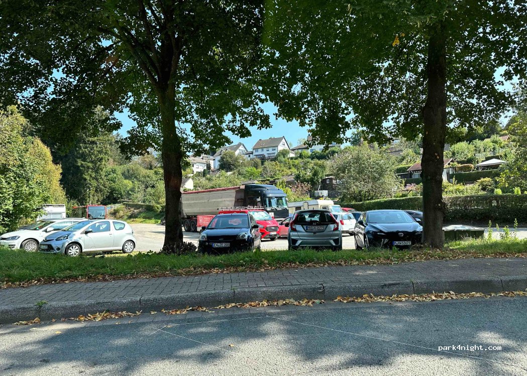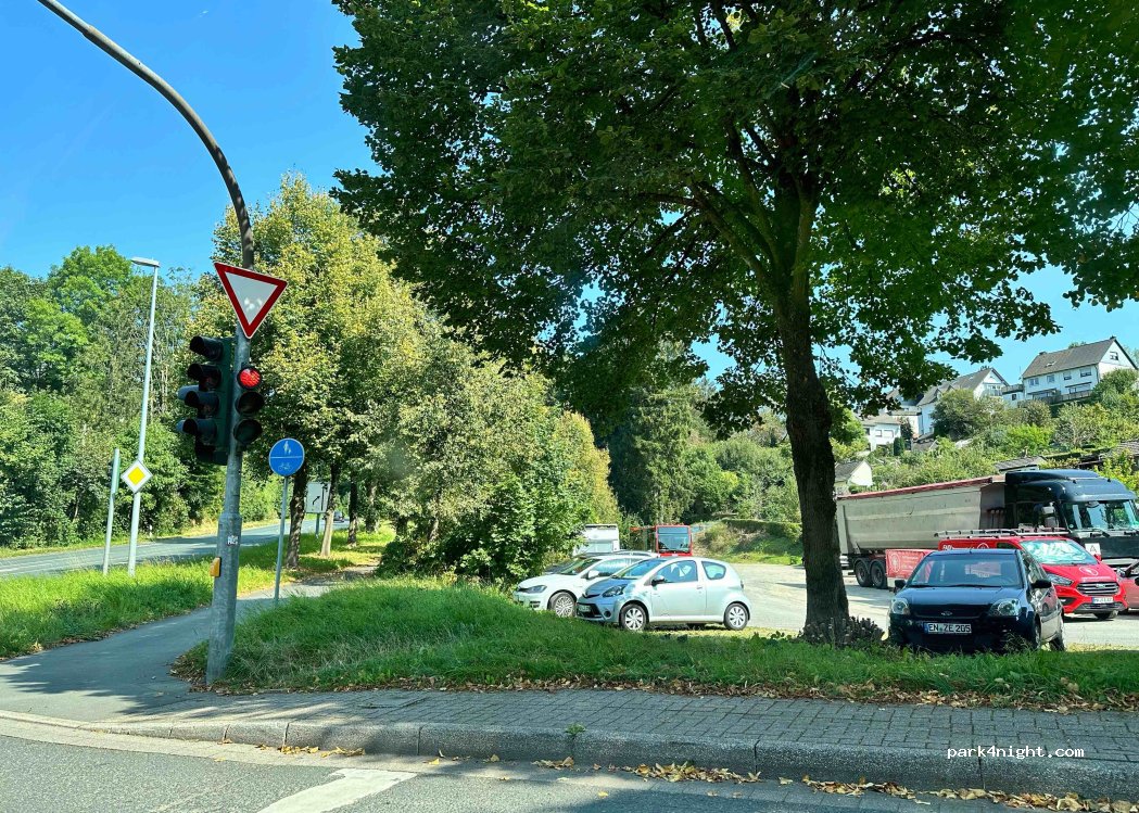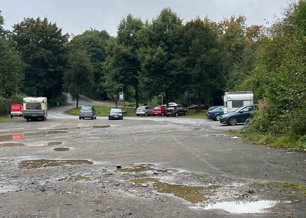 Mehr oder weniger unbefestigter Parkplatz neben einer Schrebergarten Anlage an der Bundesstraße. Wälder mit Spazierwegen und Fahrradstrecken direkt in der Nähe.