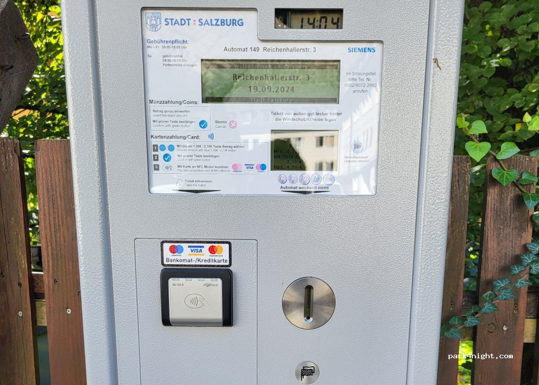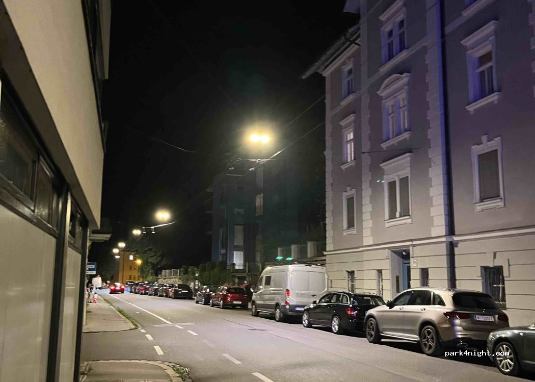 Parking on the side of the road. No problem staying overnight. We felt safe. 15 minutes walk to Salzburg's old town.