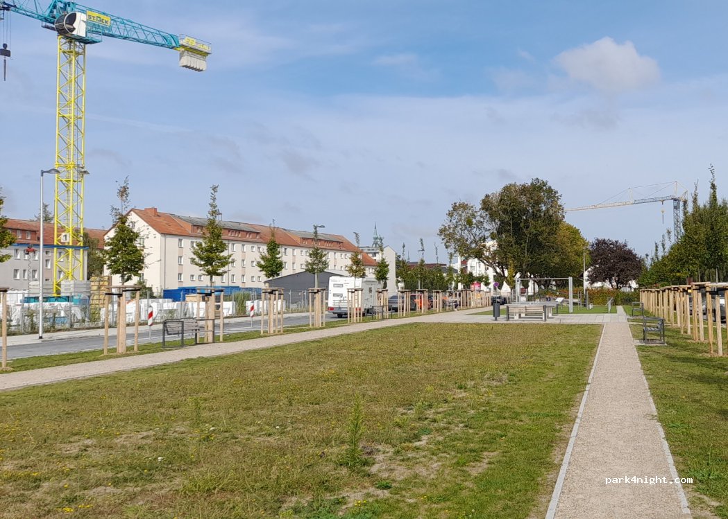 Large bande de stationnement des deux côtés du parc "Reiferbahn", apparemment nouvellement créé, également adaptée aux véhicules longs.