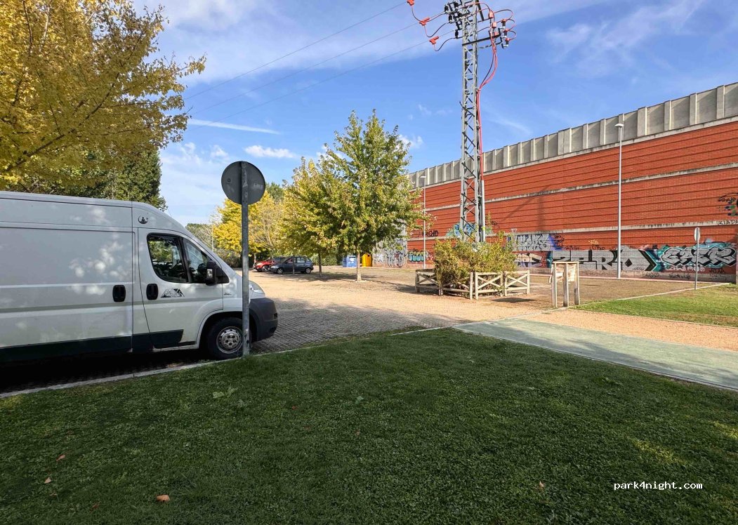 Small parking lot behind a sports hall with no prohibition signs. Next door there is a park for walking with a fitness trail and running track. A bit frequented in the morning by runners and cyclists. Spent a quiet night with the gentle sound of the river. Please take your rubbish with you and dispose of it in the rubbish bins provided. The grill bar with homemade burgers just around the corner is also recommended.