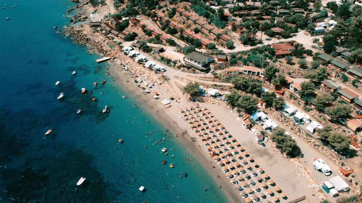 Die Stellplätze für Wohnmobile und Zelte befinden sich direkt am Meer, oberhalb eines Sandstrandes, und bieten einen herrlichen Panoramablick. Der Campingplatz bietet direkten Zugang zum Privatstrand mit Sonnenschirmen, Liegestühlen und Strandstühlen.