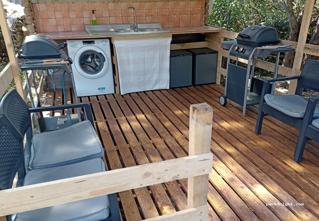 Great place to camp, nice semi outdoor shower. We were lucky that on a Saturday evening July, we were the only ones there. 45€ (our car, 2 adults and a child). Owners were friendly and gave tips for places to visit. Separate your rubbish well.