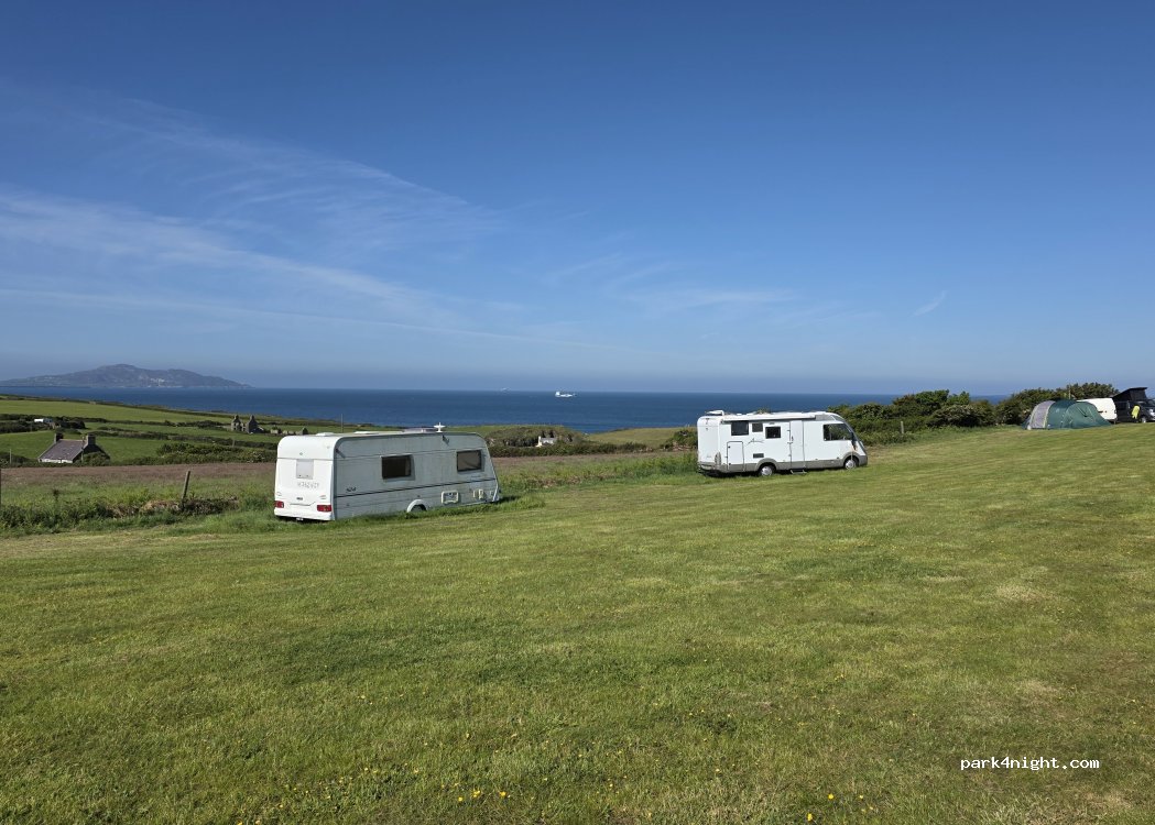 Penrhyn Bach Caravan and Camping. Farmer’s field campsite with decent toilets and fresh water. No showers. The lower fields have no phone or radio signal. The overflow field is higher up and has both .. and a great view.