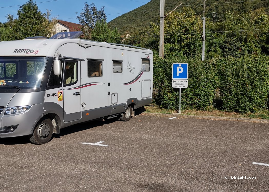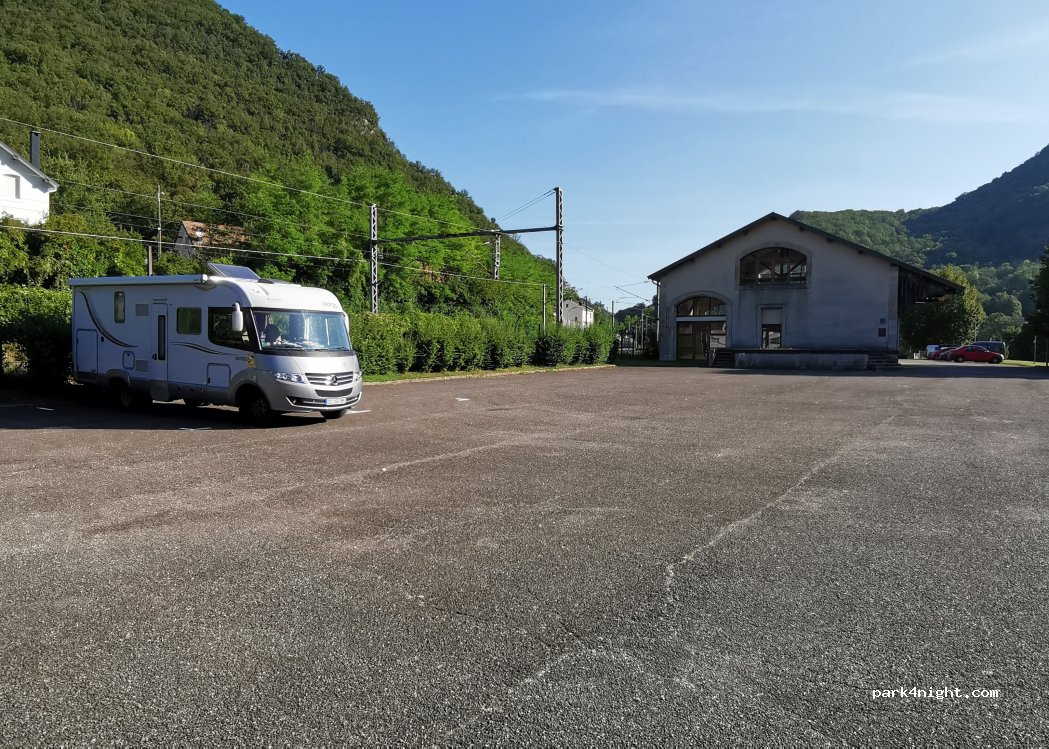 très bon parking pour dormir. Même pour grand camping car. Dernier train avant 22h et premier train le matin à 6h. très calme la nuit. Il y a un distributeur de pizza (24h/24h) en face la gare et un café, mais malheureusement nous ne les avons vus qu'en partant. Merci à la commune