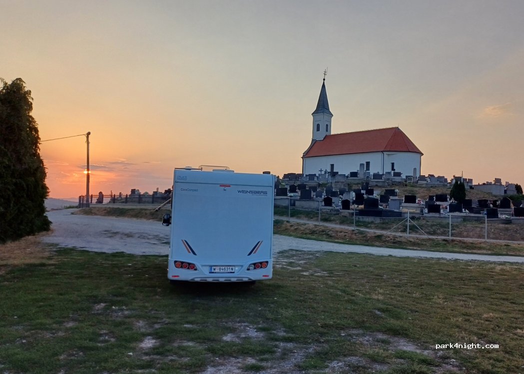 Bei einer Kirche mit Friedhof auf einem Hügel, schon von weitem sichtbar (die Kirche). Relativ großer Parkplatz. Durch die erhöhte Lage hört man zwar den Verkehr unten, aber nicht störend. Allerdings haben die Glocken um 6 Uhr geläutet (war an einem Werktag). Sonnenauf- und Untergang waren schön zu sehen (Anfang September).