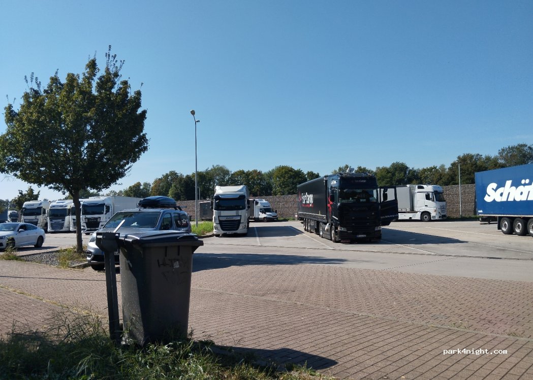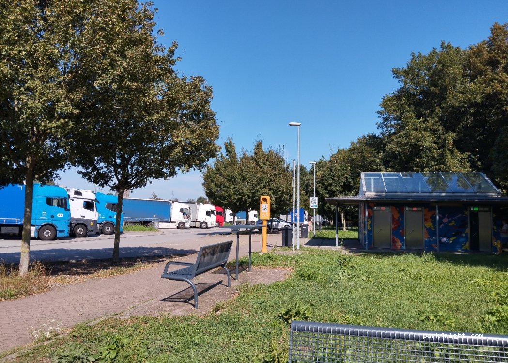 Servicebereich mit Platz für Wohnmobile, PKW und LKW, für alle Größen, Essbänke und Toiletten.