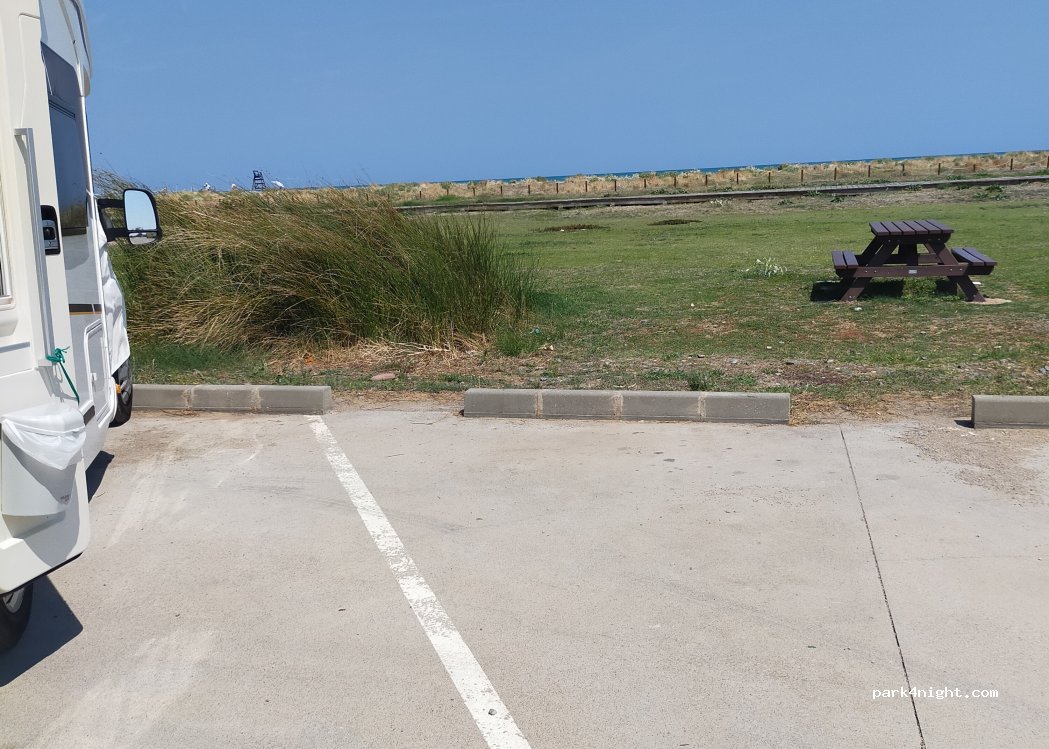 Buen sitio para pasar un par de noches. tranquilo. sin servicios. salida directa a la playa de piedras. la policía patrulla con coche eléctrico. no se les oye. portate bien. las plazas de aparcamiento no estan claras, porque hay lineas nuevas y borradas. ademas aparcan coches cuando quieren.