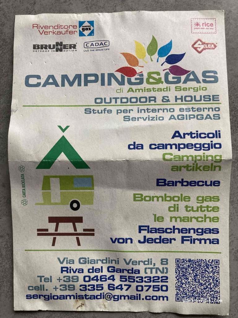 Pequeña tienda de camping como punto de repostaje de gas para, entre otras cosas, bombona verde DIN de 5 kg. El único punto de llenado que he encontrado en la zona del Lago de Garda que también puede llenar este tipo de bombonas de gas. El llenado tarda una hora.