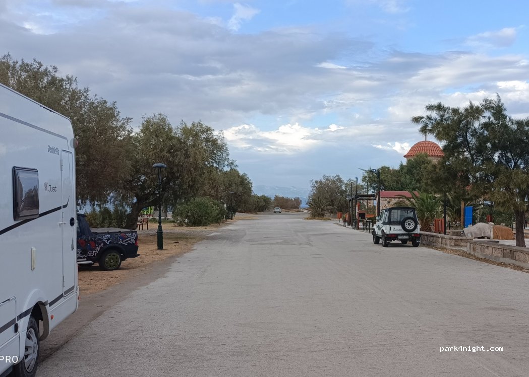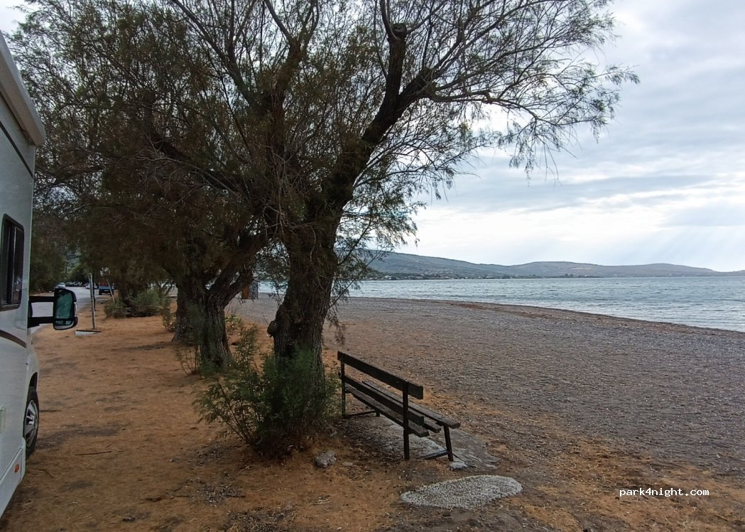 Justo al lado de la playa de guijarros finos hay nichos junto a los tamariscos donde pueden aparcar 3-4 autocaravanas. Agua de la manguera al lado de la pequeña capilla de Taxiarches. Duchas y vestuarios cada 50 metros.
