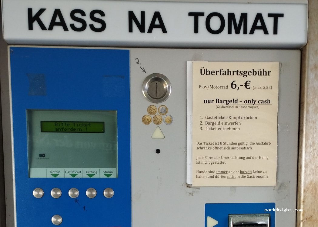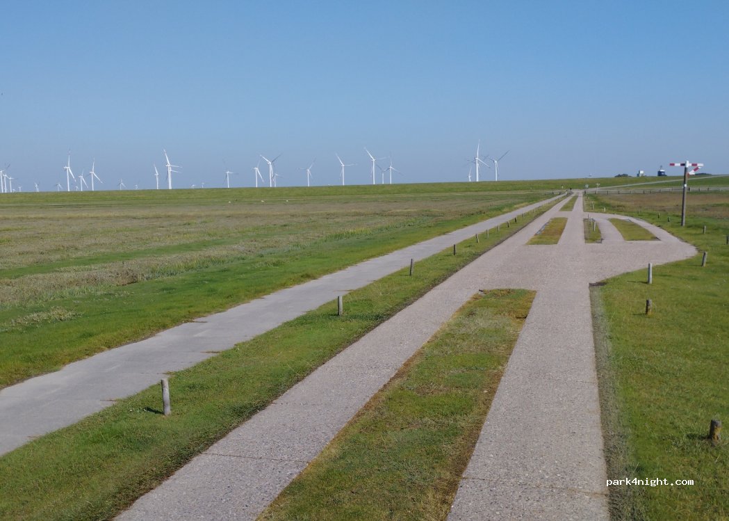 A parking lot approved for camper vans to enjoy the Hamburger Hallig during the day. In addition to an information center, the Hallig also has a restaurant with outdoor dining. The 4 km long access road is via a single-lane route with passing lanes. Access is subject to a fee and is limited to a total weight of 3.5 t.