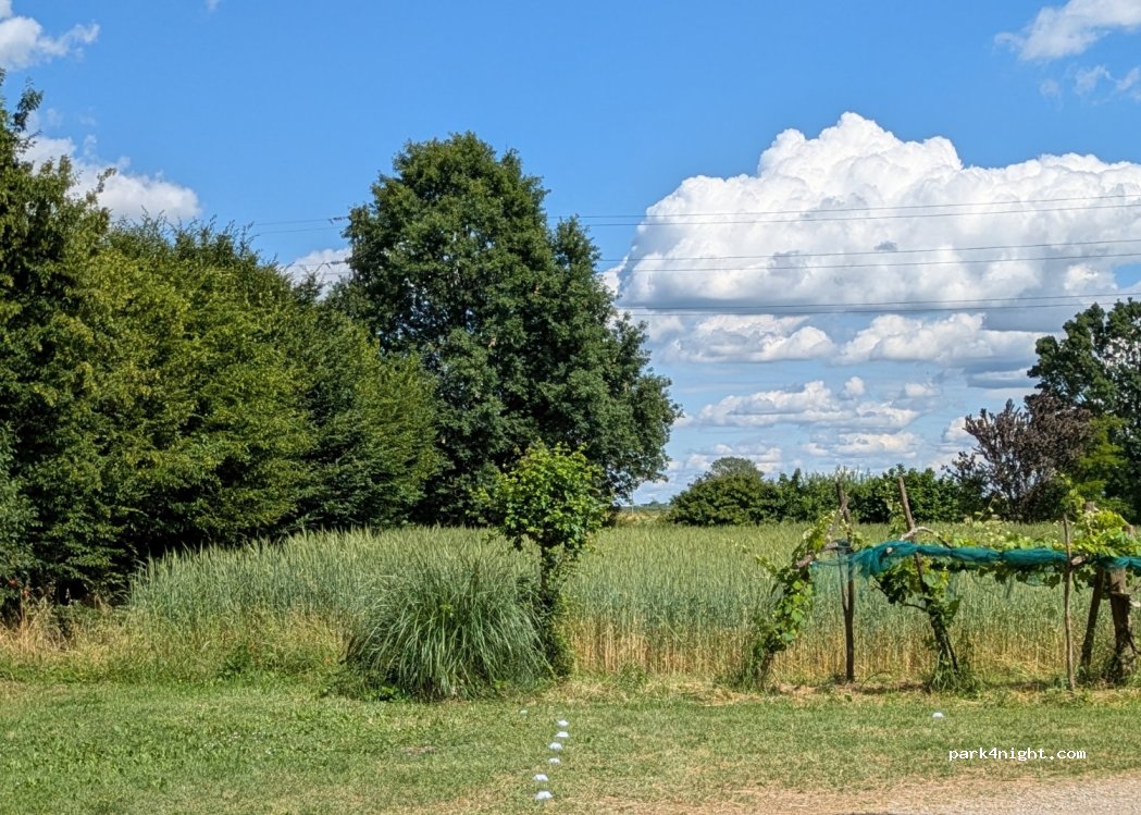 Parfait. Des emplacements cachés derrière le hangar d'une exploitation agricole. Nuit au calme, loin des voitures. Le gérant est très sympathique et enthousiaste. Il y a une salle de bain, des WC propres. On peut avoir de l'eau et de l'électricité, acheter les produits de la ferme ( pâtes, miel) et même voir des voitures et machines anciennes.