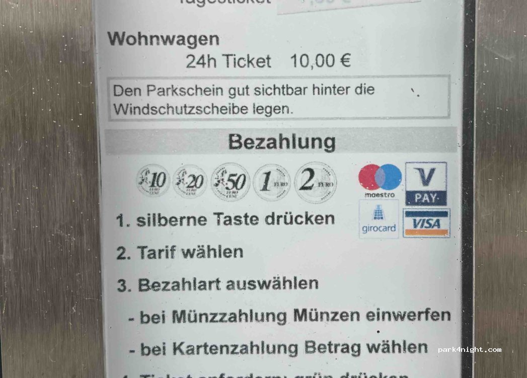 10€ für 2,5 Tage ist auch für einen Parkplatz super. Hundestrand nicht weit, schöner Park, netter Ort. Für einen Snack kann ich die Fischbox empfehlen.