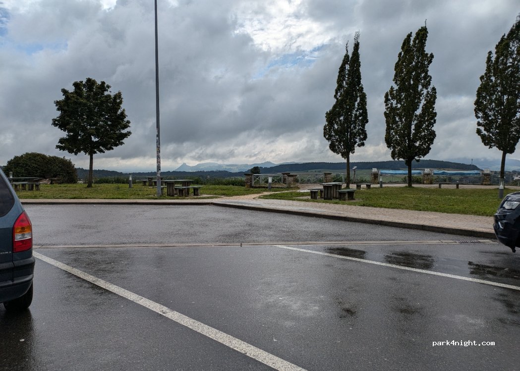 Aire de repos juste au bord de l'autoroute. Assez bruyant à cause de la circulation mais avec une belle vue
