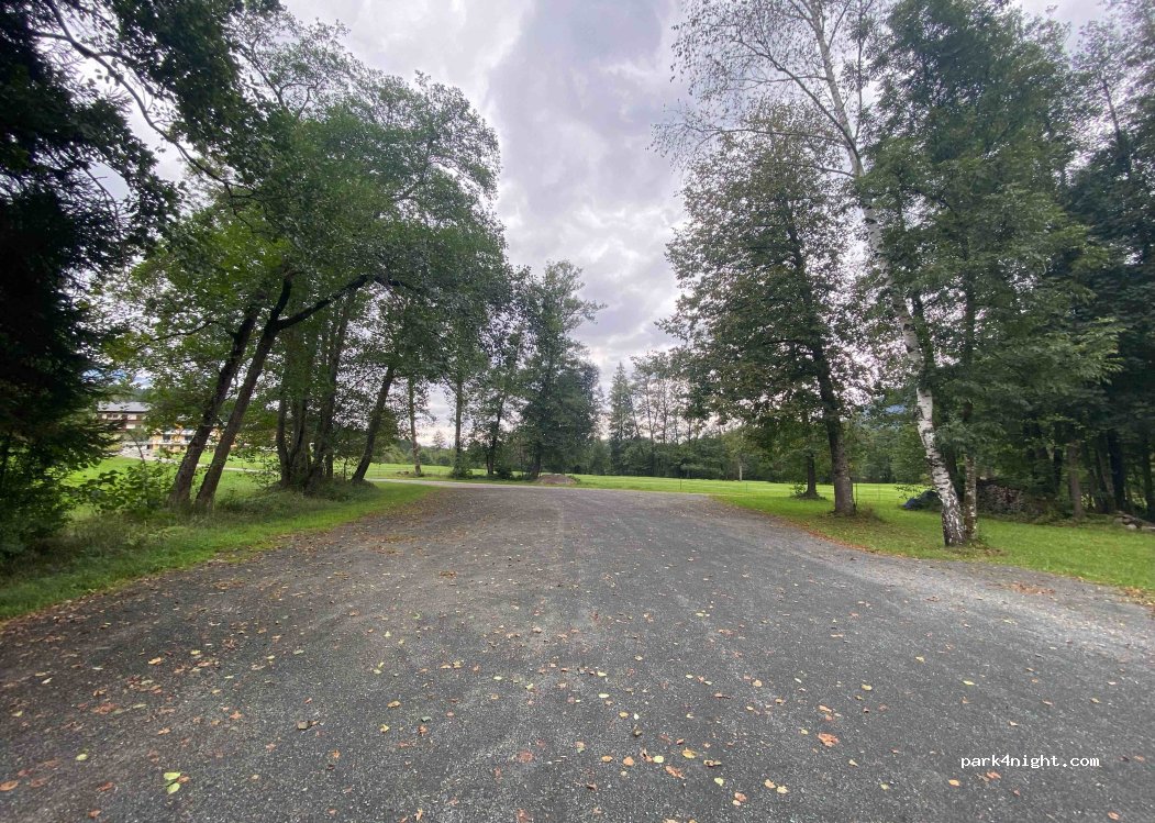 Un aparcamiento aparentemente normal en un balneario. Estuvimos allí en septiembre cuando el tiempo era peor y no había ni un solo vehículo estacionado. Todo estaba tranquilo y a nadie parecía importarle. ¡Hermosa ruta de senderismo circular alrededor del lago!