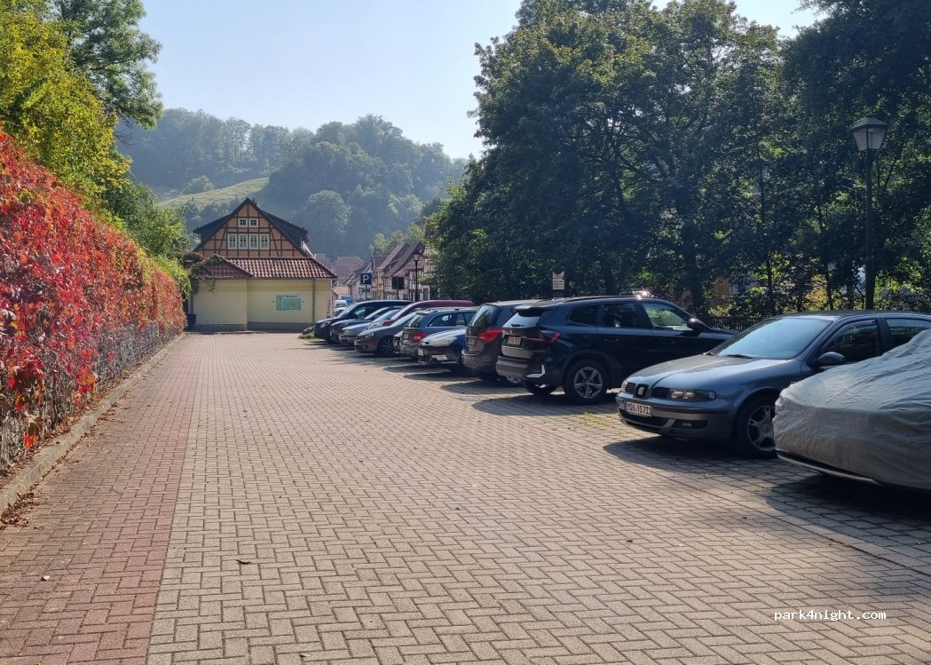 Kostenloser Parkplatz, direkt an der Straße, dafür mit öffentlichen Toiletten, Sitzgelegenheit und gutem Zugang zum Ort und Schloss