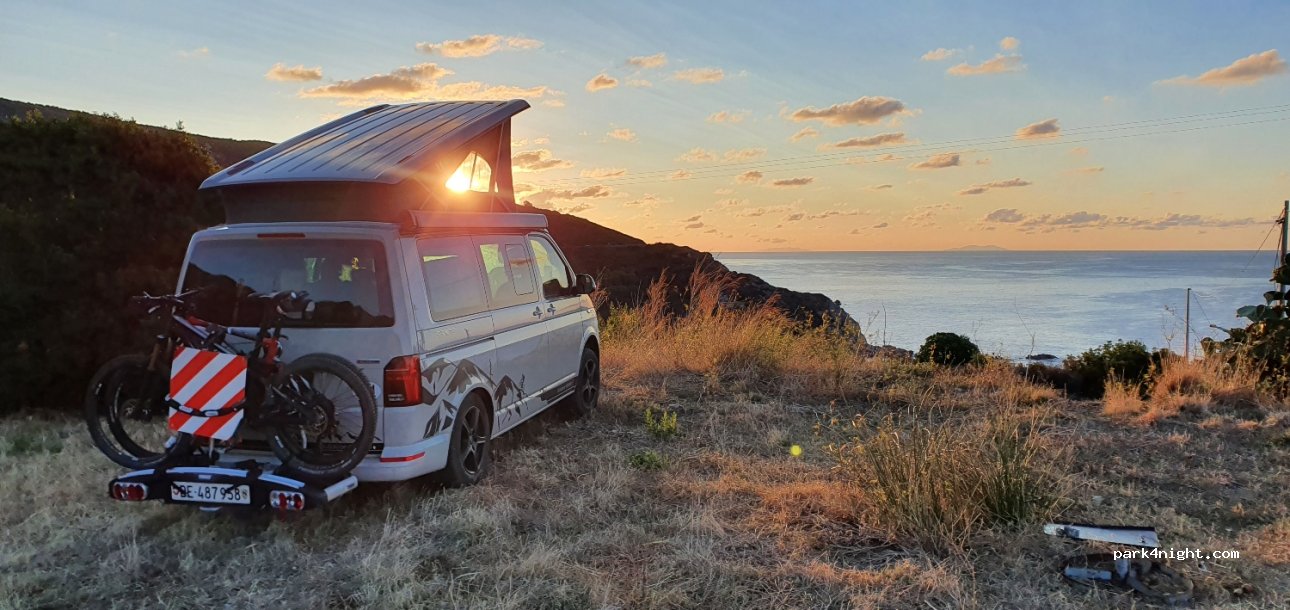Toller Platz mit schöner Aussicht. Man schläft umgeben vom Meer und der Natur. Wir verbrachten hier eine sehr ruhige Nacht. Am Abend sahen wir in der Ferne noch ein Mufflon und später spazierte eine Wildschweinfamilie über die freie Fläche. Der Platz ist sehr gerade und außer uns war niemand hier.