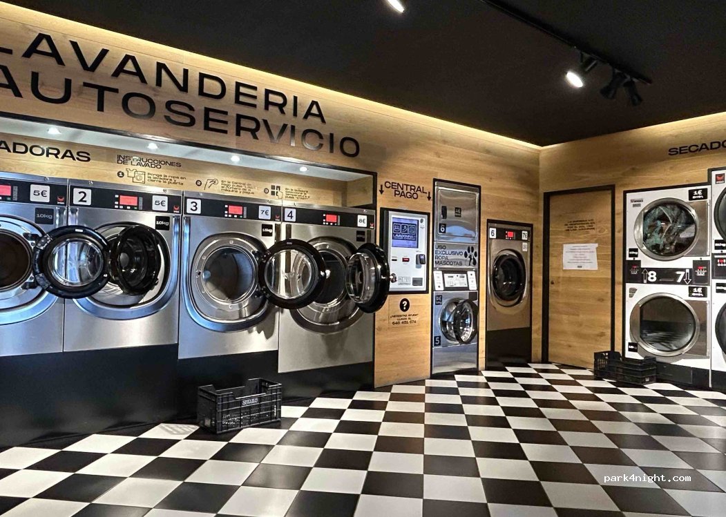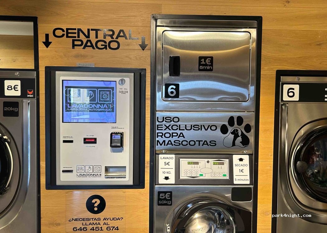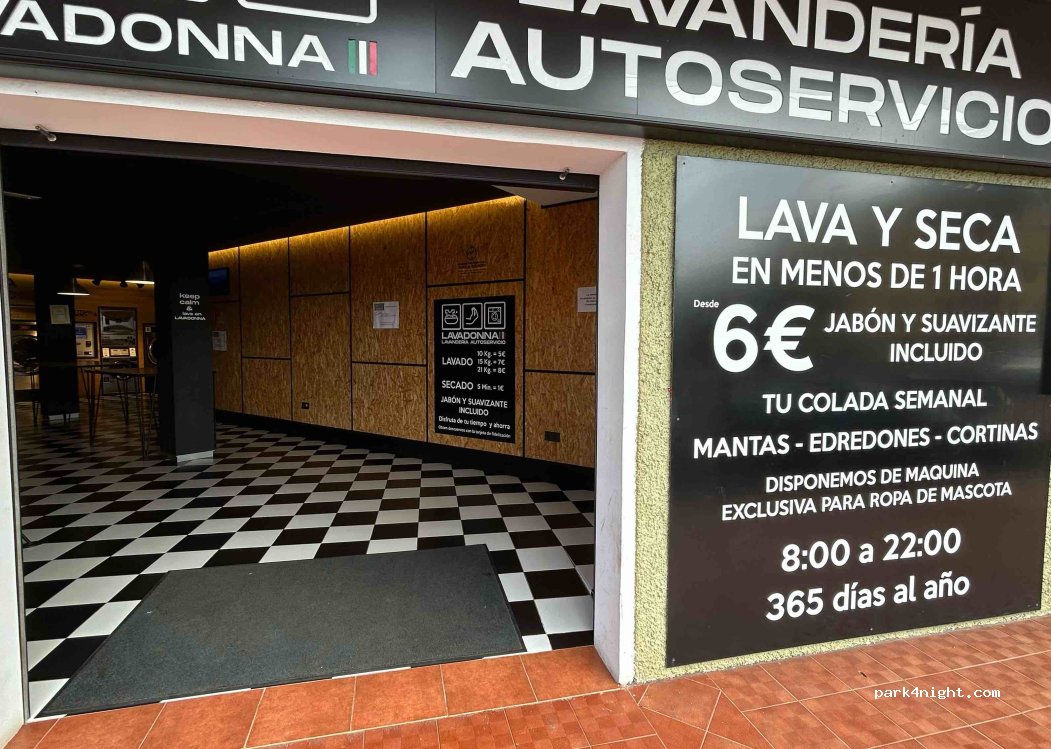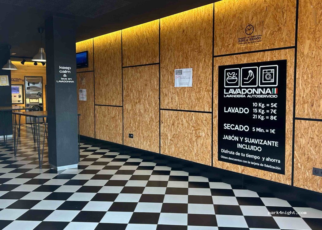Man kann gut mit dem Wohnmobil an der Straße parken. Saubere Wäscherei, hat 365 Tage im Jahr geöffnet. Man kann mit Karte bezahlen