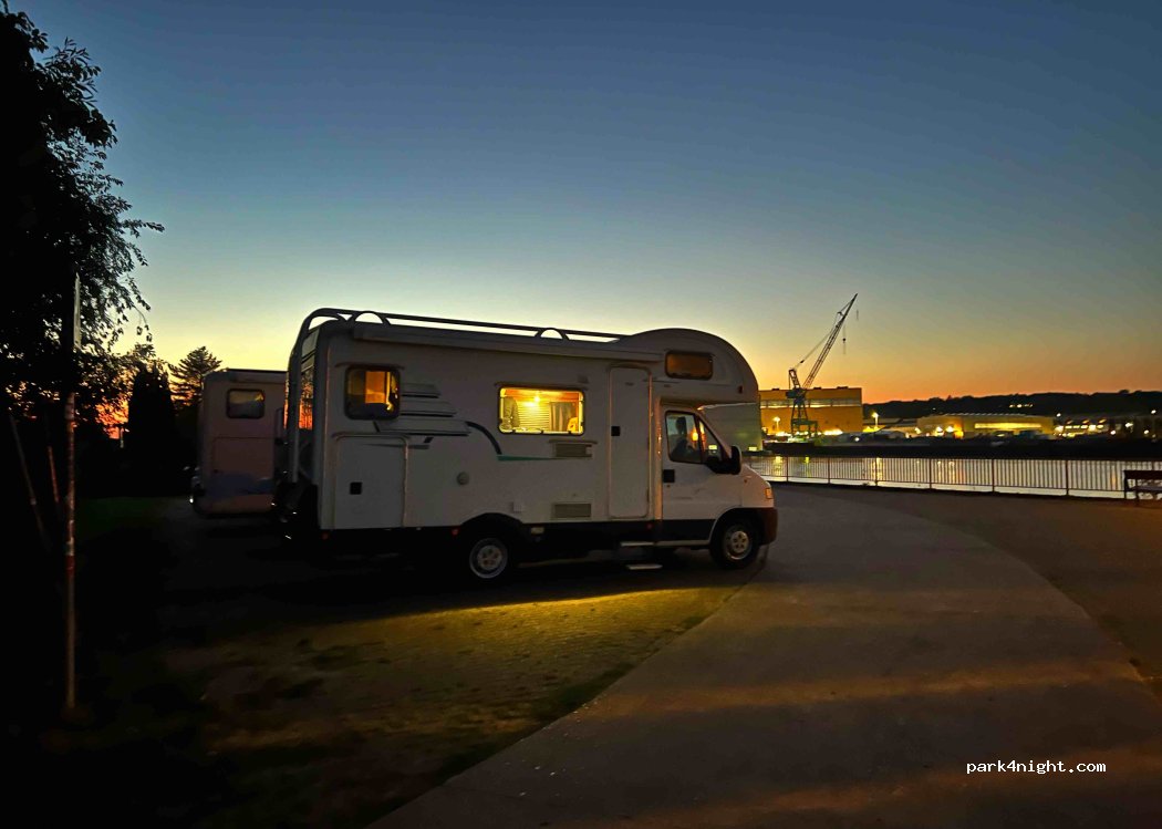 Arrived at night, seemed to be in an industrial area but clean and super quiet, by the water. There is a bench and a small bin. And free. Thank you the city