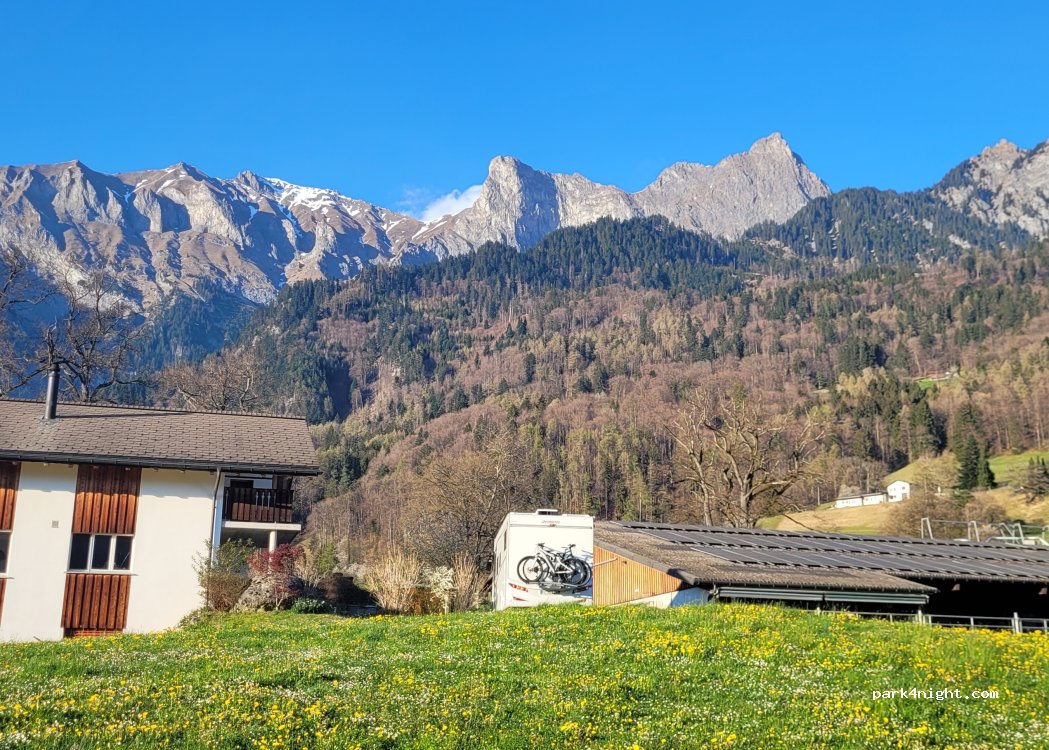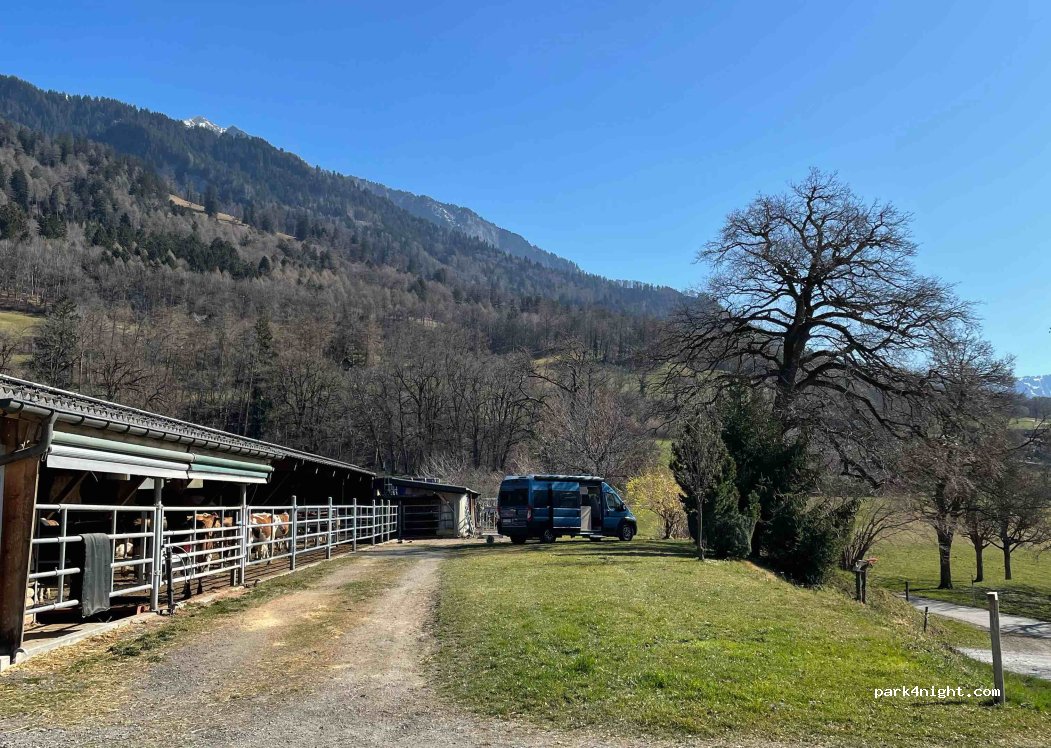 Endroit magnifique avec des propriétaires très sympas. Il y a 3 Emplacements devant l'étable avec une jolie vue. Idéal pour familles et enfants. on peut voir des animaux et il y a de l'espace pour jouer. il y a des WC et un lavabo à disposition dans la grange. Nous avons acheté du délicieux fromage d'alpage. A 2 minutes en voiture du parking de Heidi Dorf. Je recommande pleinement.
