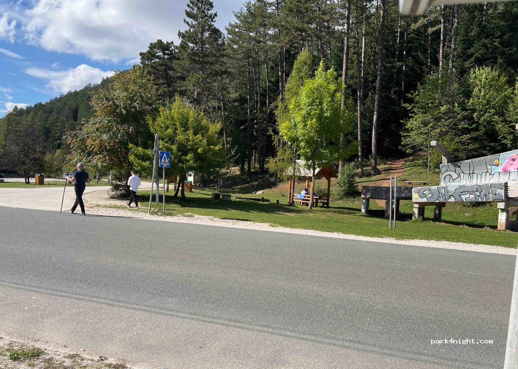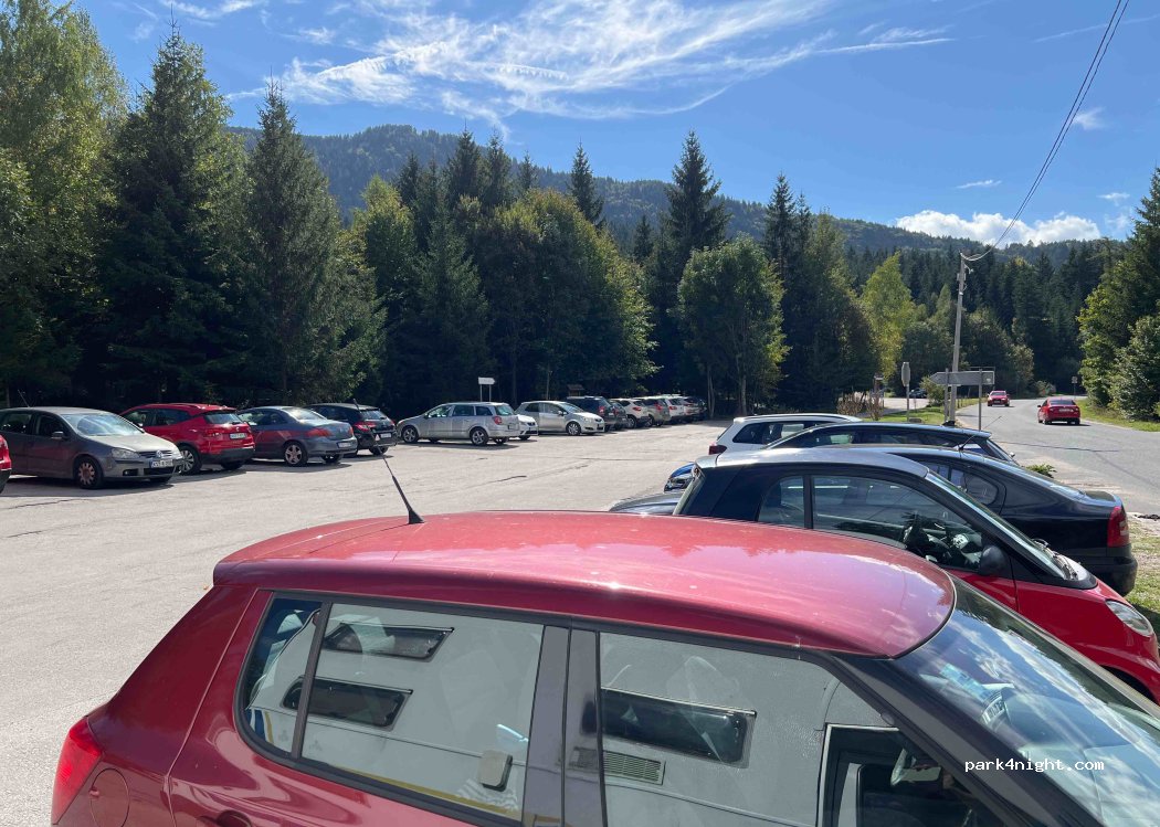 Hotel Pino car park, well frequented during the day and therefore safe. Picnic facilities and portable toilets at the start of the hiking trail. Short hiking trail to the former bobsleigh run and the cable car into town. Also good for use as a P+R for sightseeing in the town. Hotel next door, restaurant available if staying overnight.