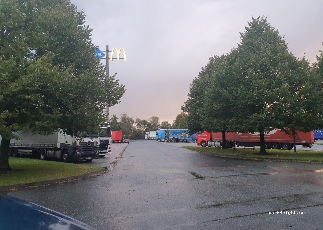 Estacionamiento sencillo donde los camiones hacen una parada para pasar la noche. Hay una estación de Aral y un McDonald's.
