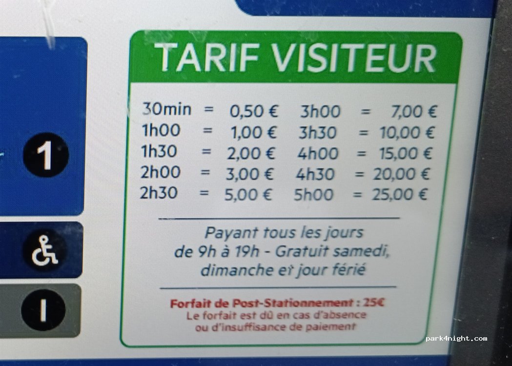 nous avons passé une très bonne nuit. le parking est payant la journée de 9 a 19h et gratuit le weekend et la nuit j'ai mis la photo des prix. très proche du centre ville et de la citadelle. possibilité de payer par l'application easypark très pratique.