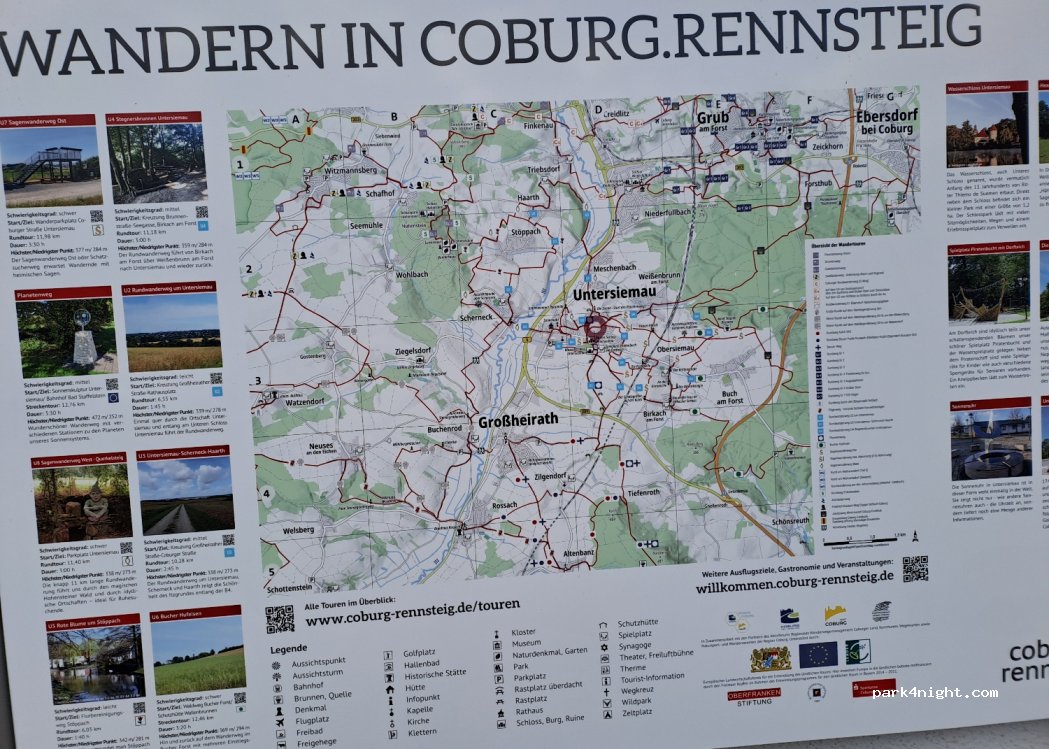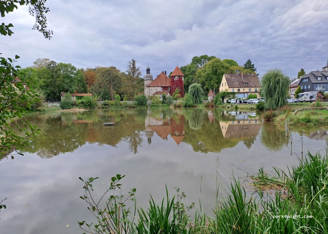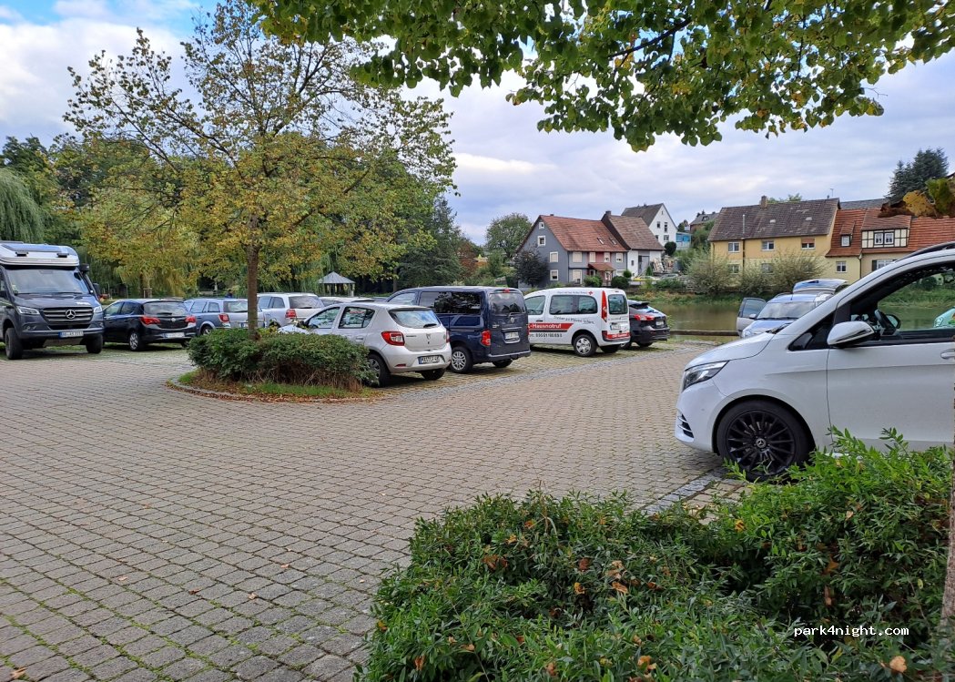 Kleiner Parkplatz im idyllischen Ort Untersiemau direkt an einem Teich und schön eingebettetem Spielplatz mit Sitzbänken und Tischen und Blick auf das Wasserschloss. Eine sehr saubere öffentliche Toilette ist in unmittelbarer Nähe. In wenigen Gehminuten ist ein sehr gutes kleines griechisches Restaurant zu finden. Nachts herrscht hier absolute Ruhe. Eher für Camper <6 m geeignet. An einigen Parkbuchten ist es auch möglich mit größeren Campern zu stehen, sofern diese Bodenfreiheit haben, um über einem Begrenzungsbalken mit dem Heck zu stehen.