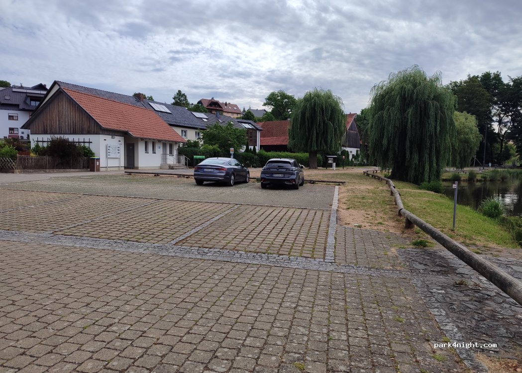 Small parking lot in the idyllic town of Untersiemau right next to a pond and a beautifully embedded playground with benches and tables and a view of the moated castle. A very clean public toilet is in the immediate vicinity. A very good little Greek restaurant can be found within a few minutes' walk. It is absolutely quiet here at night. More suitable for campers <6 m. In some parking bays it is also possible to park with larger campers, provided they have enough ground clearance to stand with the rear over a barrier bar.