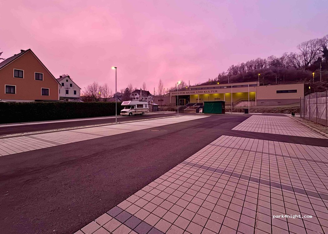Quite large parking lot next to a sport centre, at the time of my visit almost empty and very quiet. Good enough for a sleepover on longer journeys.