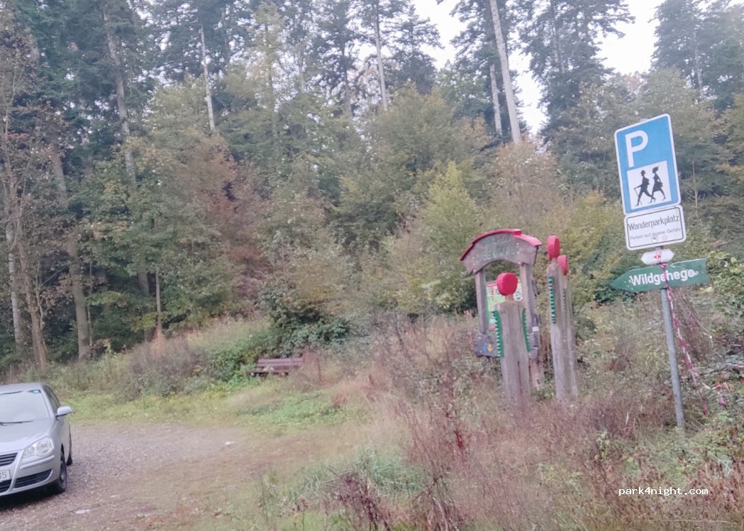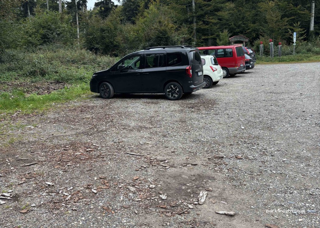 Hikers' car park. Very quiet after 8pm. Slightly sloping, but almost straight at the bottom. Continue to the wildlife enclosure (parking overnight is not permitted), particularly worthwhile with children. No infrastructure, one bench and car park. Poor reception, but doable for streaming.