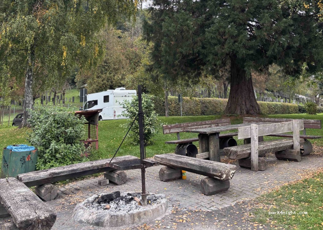 Parking face au cimetière juif. Il y a environ 5 places de stationnement possibles de 6,50 m de long. Il y a un coin barbecue et une belle vue sur la plaine, parfait pour passer la nuit.