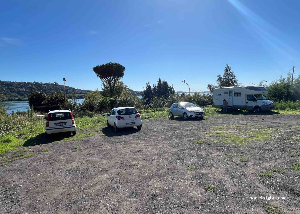 Aparcamiento a lo largo de la carretera que bordea el lago en las laderas de Trevignano. Se puede llegar a la ciudad a pie o en bicicleta en pocos minutos. Terreno inclinado y desigual en algunos lugares.