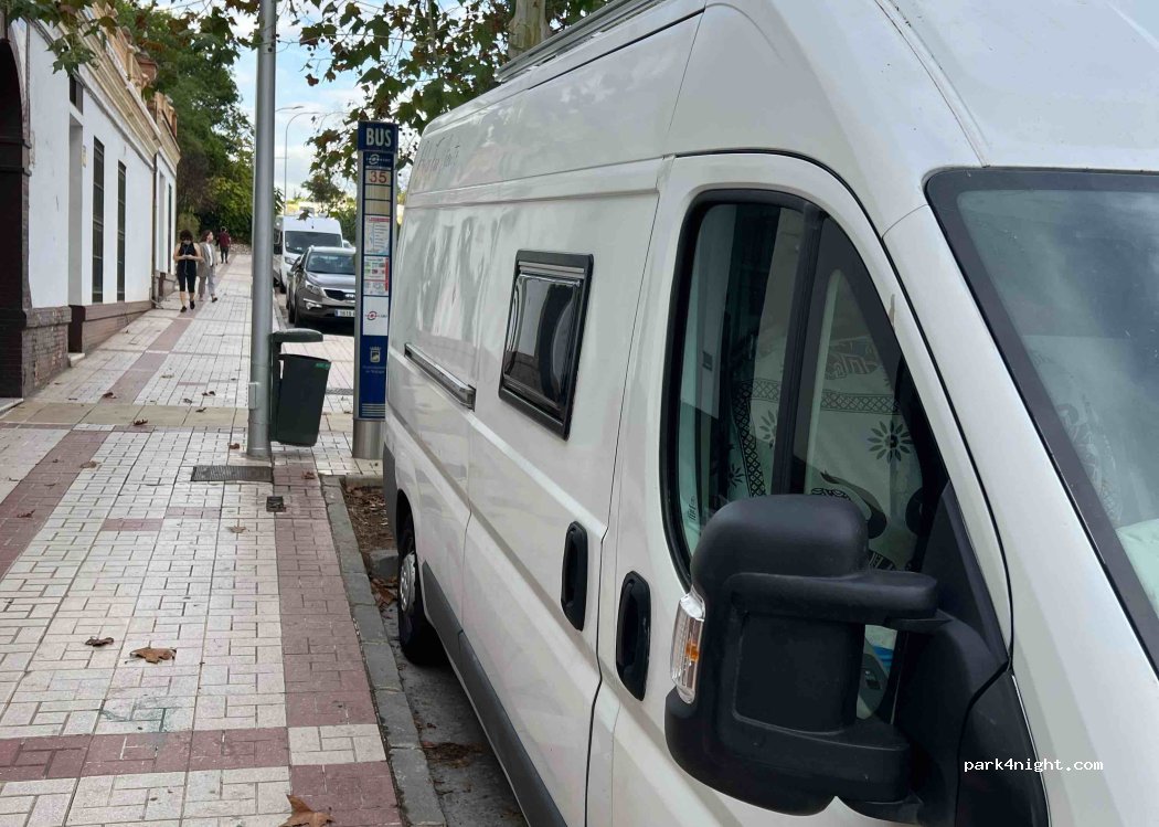 Aparcamiento en línea gratuito con desnivel y contenedores cerca. A unos 30 minutos del centro andando pero al lado hay parada de bus que te deja en 8 minutos en el centro. Hay muchísimo tránsito de coches que a veces balancean la camper según la velocidad con la que pasen. Es bastante molesto. Zona residencial que carece de parques y verdes cercanos si vas con perros... A 5 minutos de la playa.