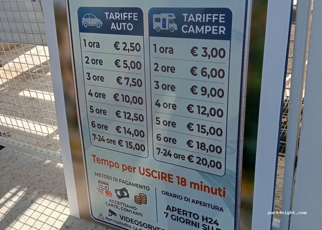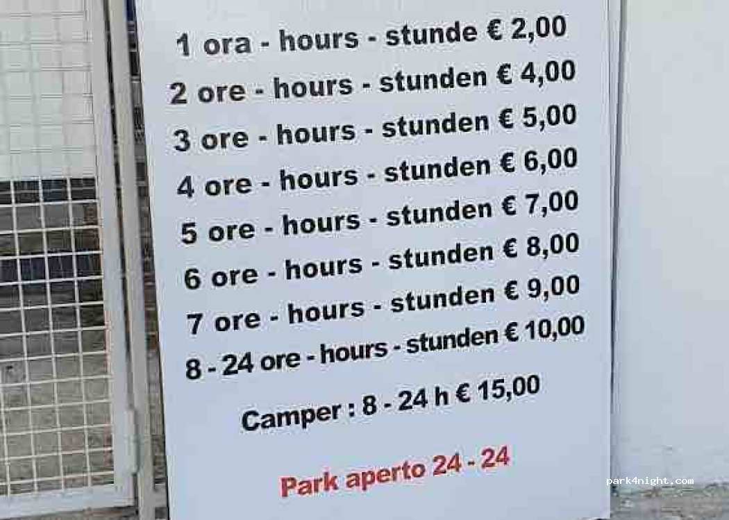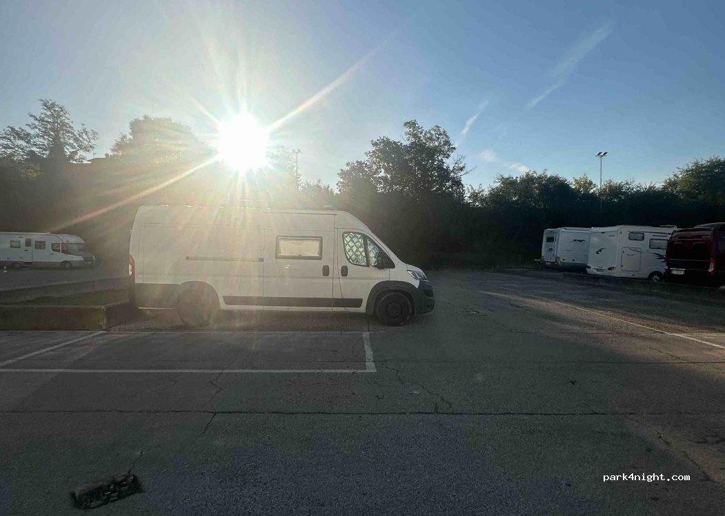Attenzione: all'interno di quest'area non esiste una zona specifica dedicata per i veicoli ricreazionali, ma questi vengono sistemati in mezzo alle auto; indi per cui lo spazio disponibile è esiguo ! Ciononostante i parcheggiatori (madre e figlia) cercano di fare il possibile ai fini di poterti alloggiare... Comunque il problema spazio rimane. Infine confermo che è consentito il pernottamento.