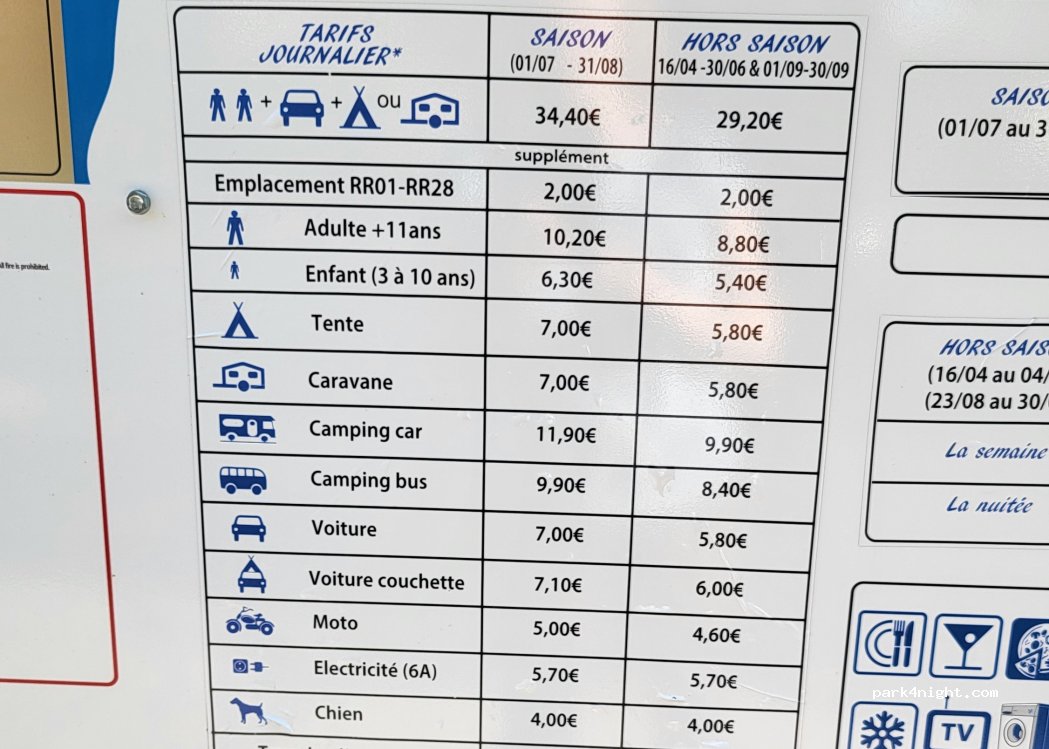 Camping avec accès direct plage. Un peu cher 28 euros hors saison pour un fourgon et 2 adultes sans électricité. Attention si besoin de recharger en eau il faut acheter un jeton à l accueil 7 euros en plus du forfait emplacement.