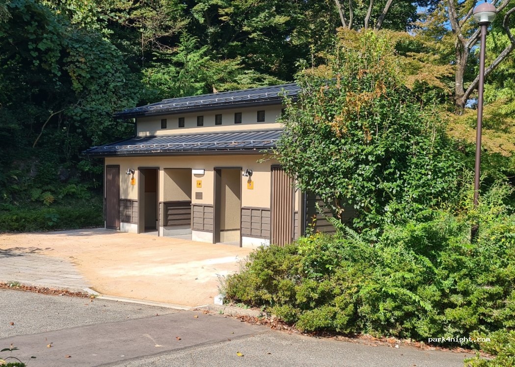 Parking publique dans le Park Utatsuyama. Toilette propre avec eau chaude dans le sanitaire PMR. Point d'eau potable ainsi que évier au niveau du golf à 20 - 30 mètres des sanitaires.