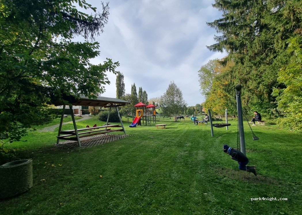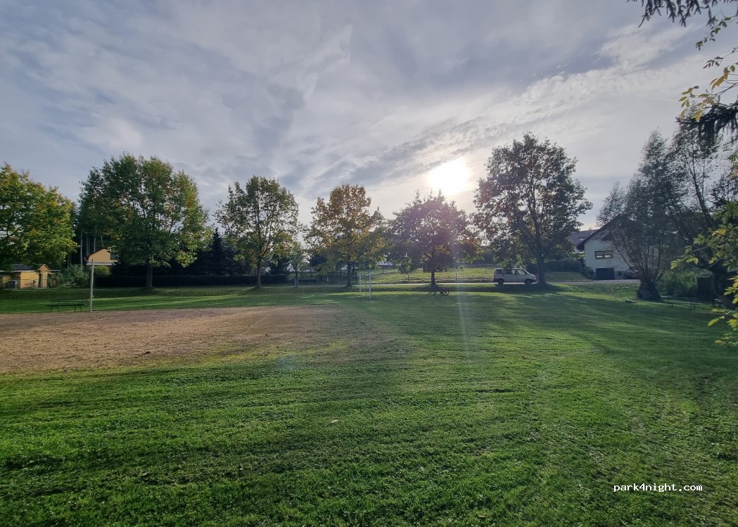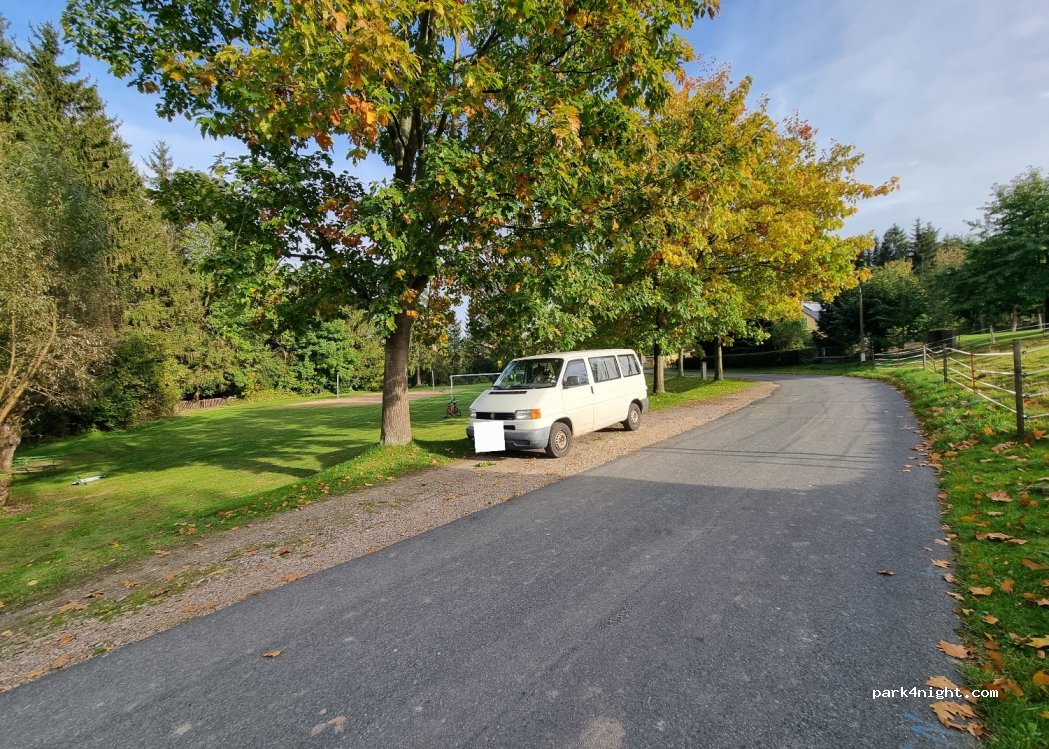 Stellplatz am Straßenrand beim Bolzplatz. Spielplatz mit überdachter Sitzgelegenheit gleich nebenan. Bach mit Brücke für einen Waldspaziergang.