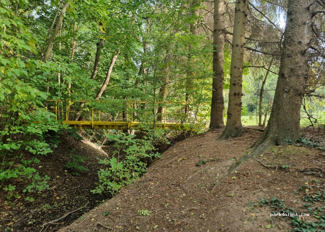 Plaza de aparcamiento al lado de la carretera, junto al campo de fútbol. Zona de juegos con asientos cubiertos justo al lado. Arroyo con puente para pasear por el bosque.